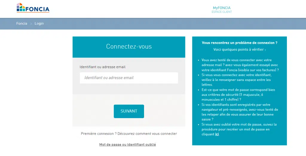 Ensuite, une fois que vous souhaitez vous connecter à votre espace personnel myfoncia, il vous suffit de saisir votre identifiant et votre mot de passe.