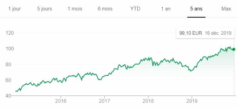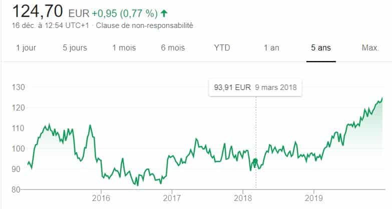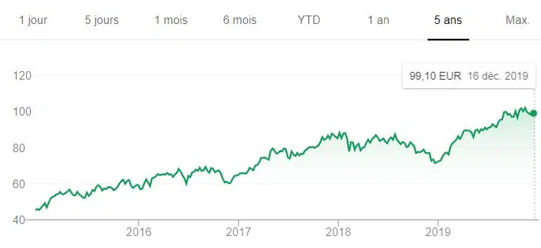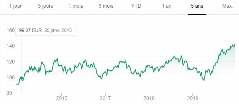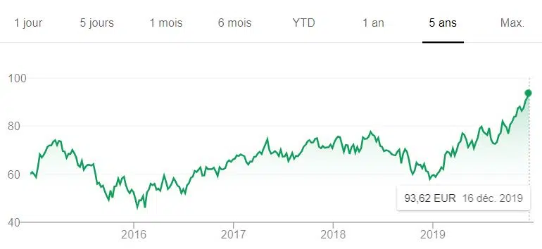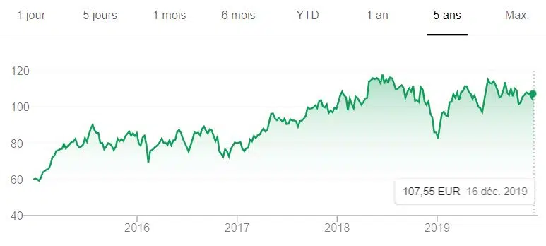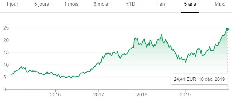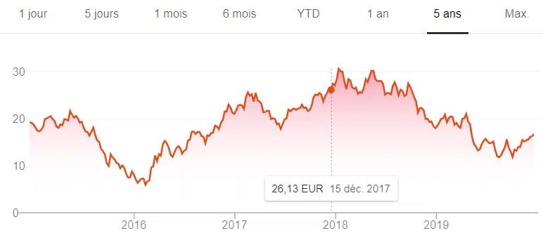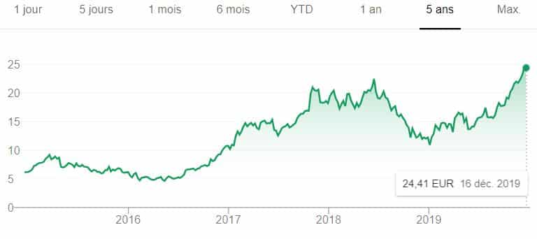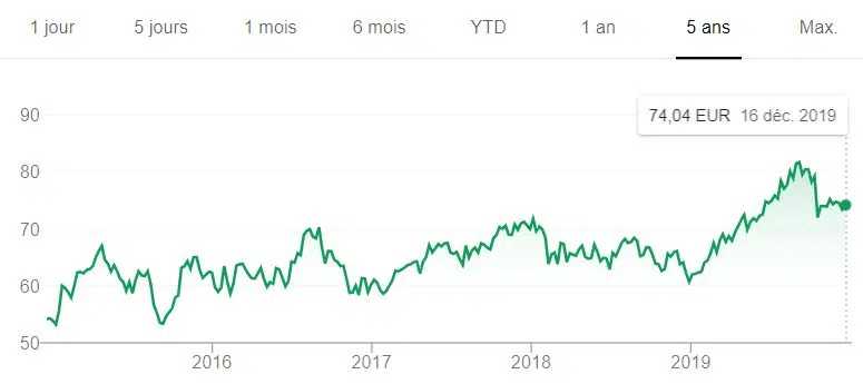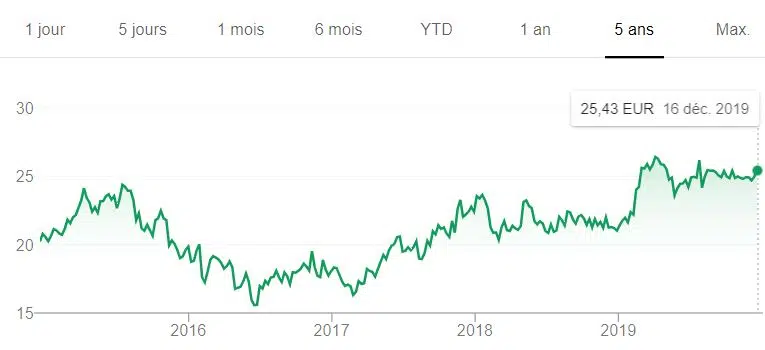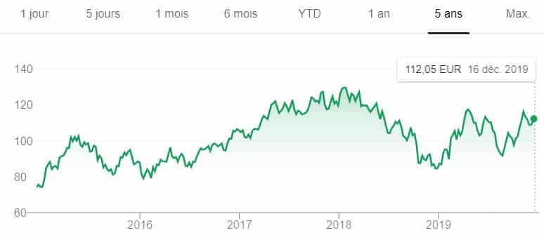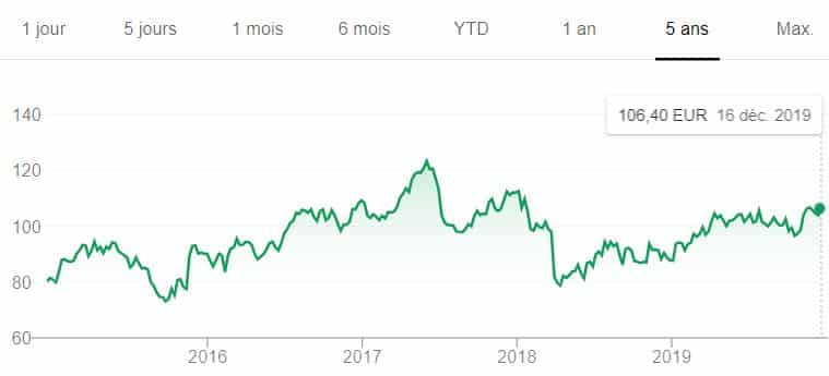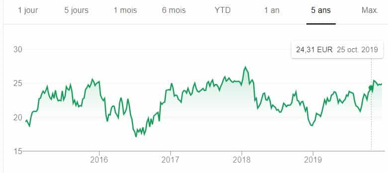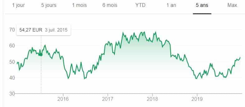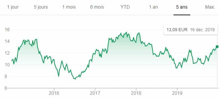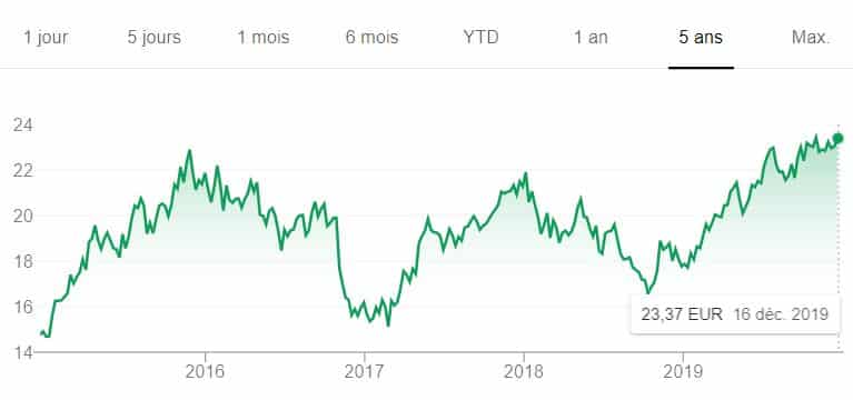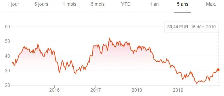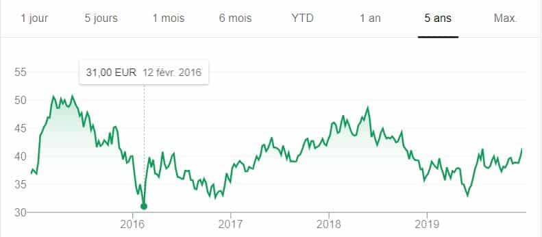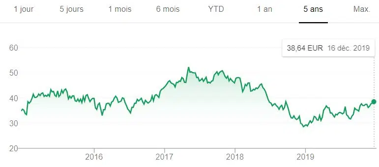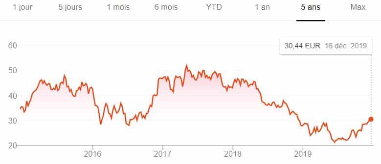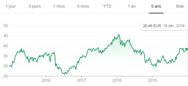 Très diversifié, ce géant français a connu un creux en 2016 avec une part proche de 25 €. Mais, en 2019, le cours a prospéré vers 35 euros avant de les dépasser légèrement en fin d’année.