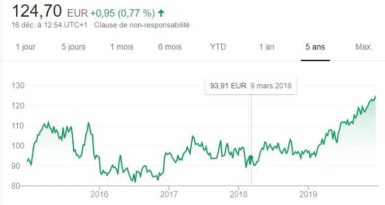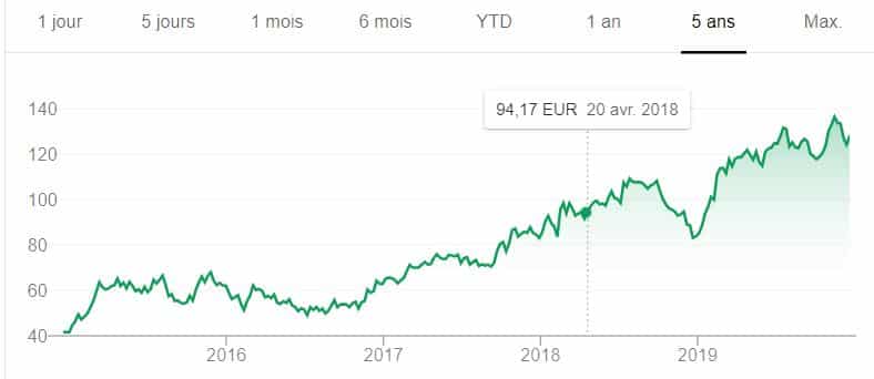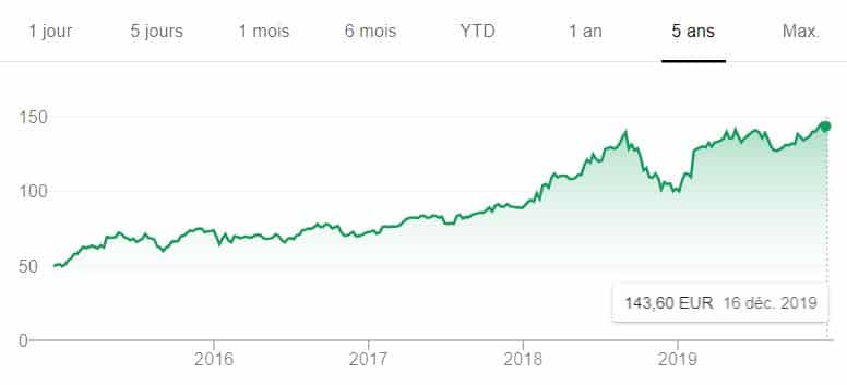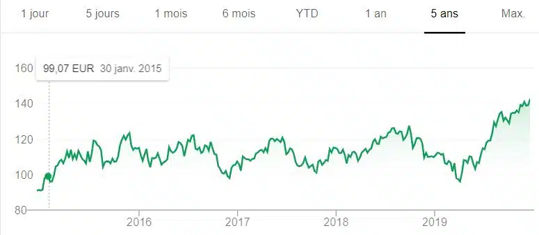 Toutefois, comme le montre la courbe inférieure, Dassault Systèmes s’est avéré être un excellent investissement ces dernières années. En 5 ans, le stock est passé de 50 à plus de 140 €.
