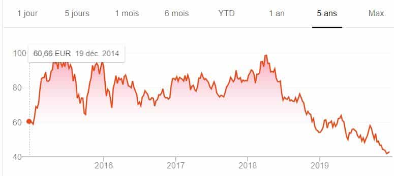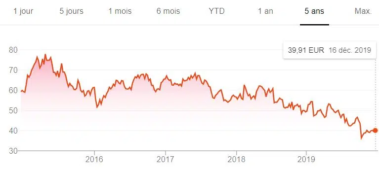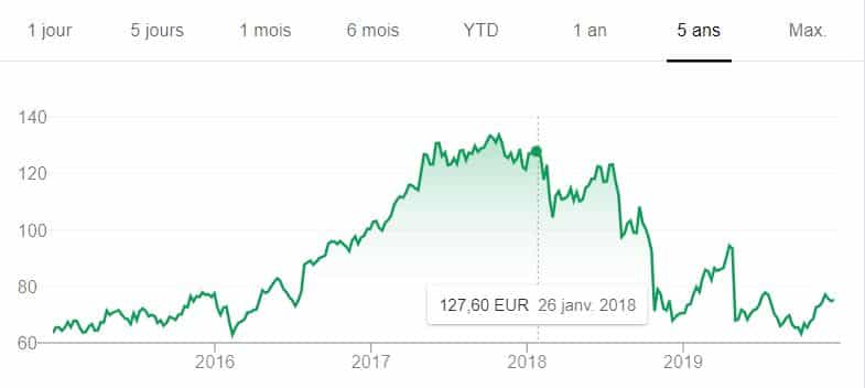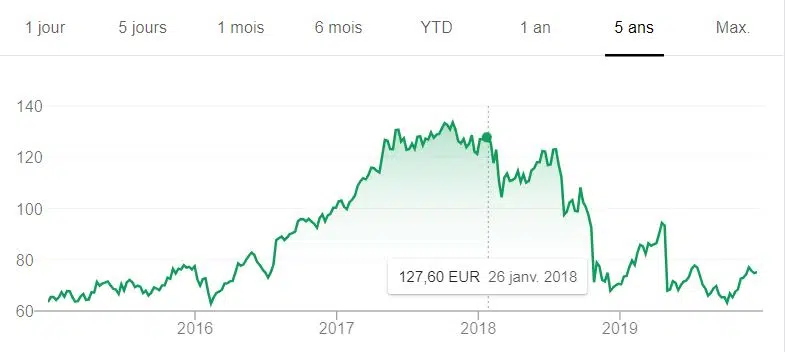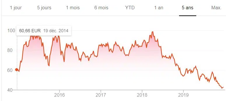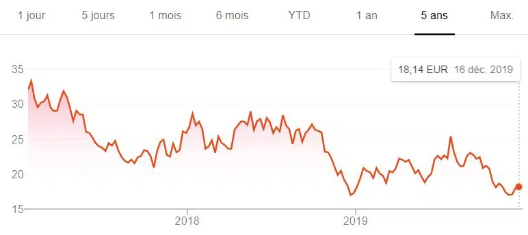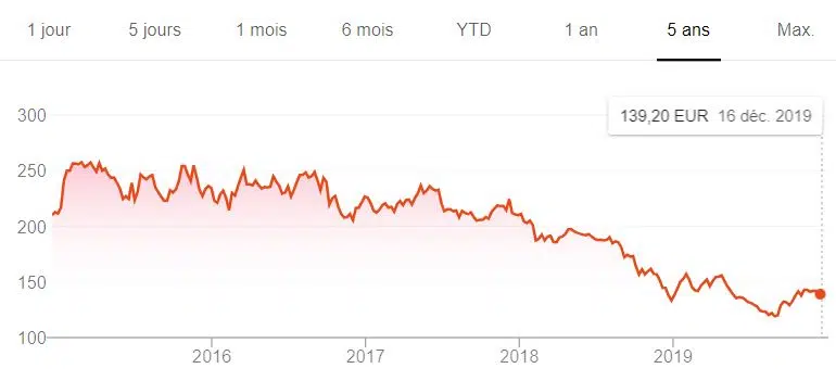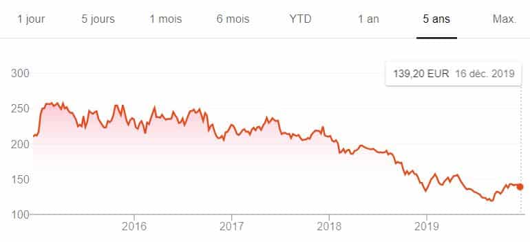 Les actions ont fortement chuté depuis fin 2017, mais ont légèrement baissé depuis mi-2019, même si elles sont loin d’être supérieures à 250 euros comme en 2015.