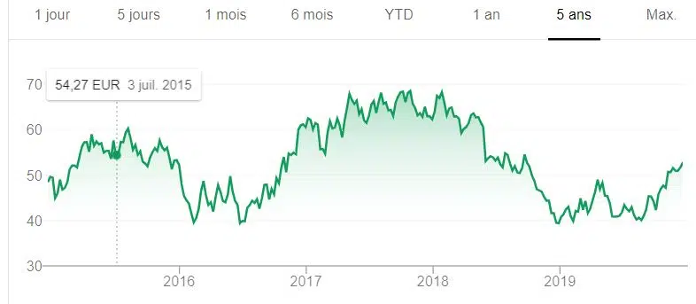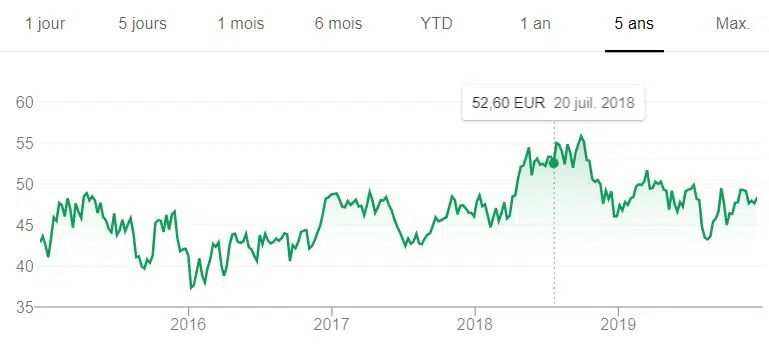 Le stock de Saint Gobain semble avoir trouvé sa fourchette préférée et évolue entre 30 et 50€ au cours des cinq dernières années.