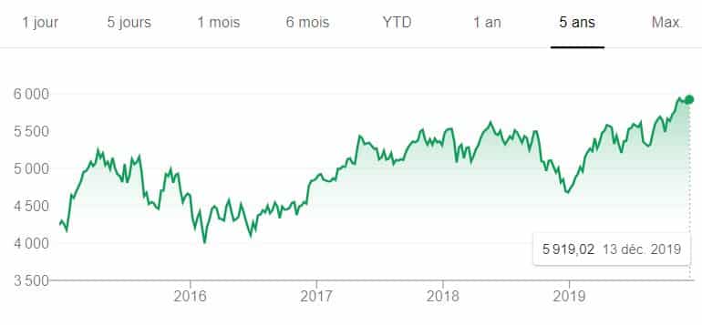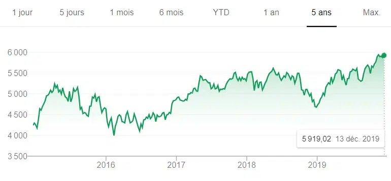 Voici l’évolution du prix de l’indice CAC 40 au cours des 5 dernières années :
