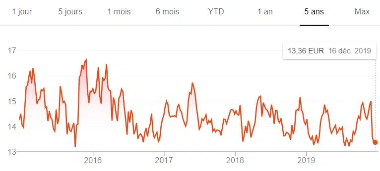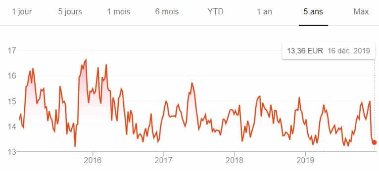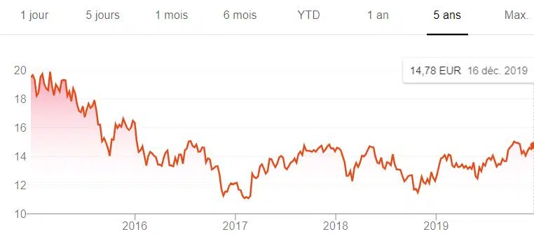 Comme tous les acteurs télécoms, Orange a explosé après la bulle des années 2000. Son prix a dépassé 200€ avant de s’effondrer. Depuis, le stock est resté stable. Ce tableau des cinq dernières années semble bouger beaucoup, mais regardez l’ordonnance. Il se situe entre 13 et 17 €.