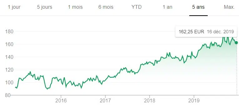 Cours de l’action EssilorLuxottica pendant 5 ans :